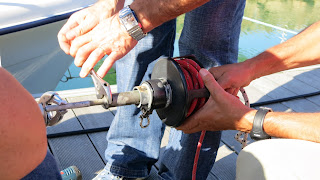 L'étai a été changé par Mr Thierry PHELIPPEAU d' ACTS SERTISSAGES CABLES cet après-midi, ce qui nous a permis de voir l'enrouleur de plus près, merci à tous ceux qui se sont déplacés pour aider à la manip .